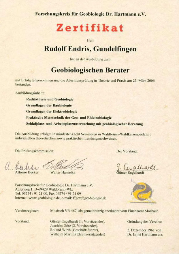 Anfang 2006 habe ich die Prüfung zum “Geobiologischen Berater” beim Forschungskreis Dr. Hartmann abgelegt und seit April 2006 arbeite ich selbständig als Geobiologischer Berater und Rutengänger.